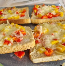 Heute durfte Nina aus dem Offenen Ganztag (OGT) mit mir zusammen Pizza-Toasts als leckeren Mittagssnack für die ganze OGT – Gruppe zubereiten.