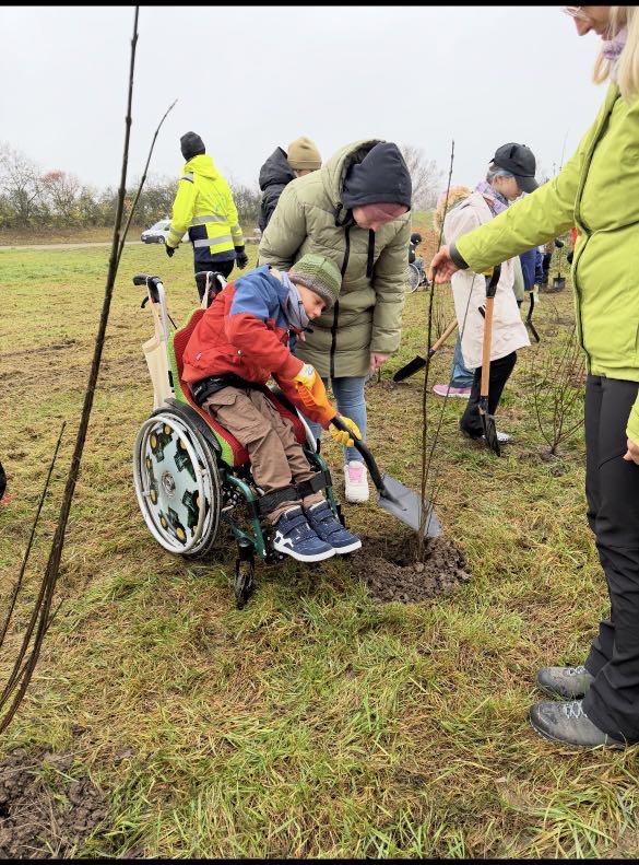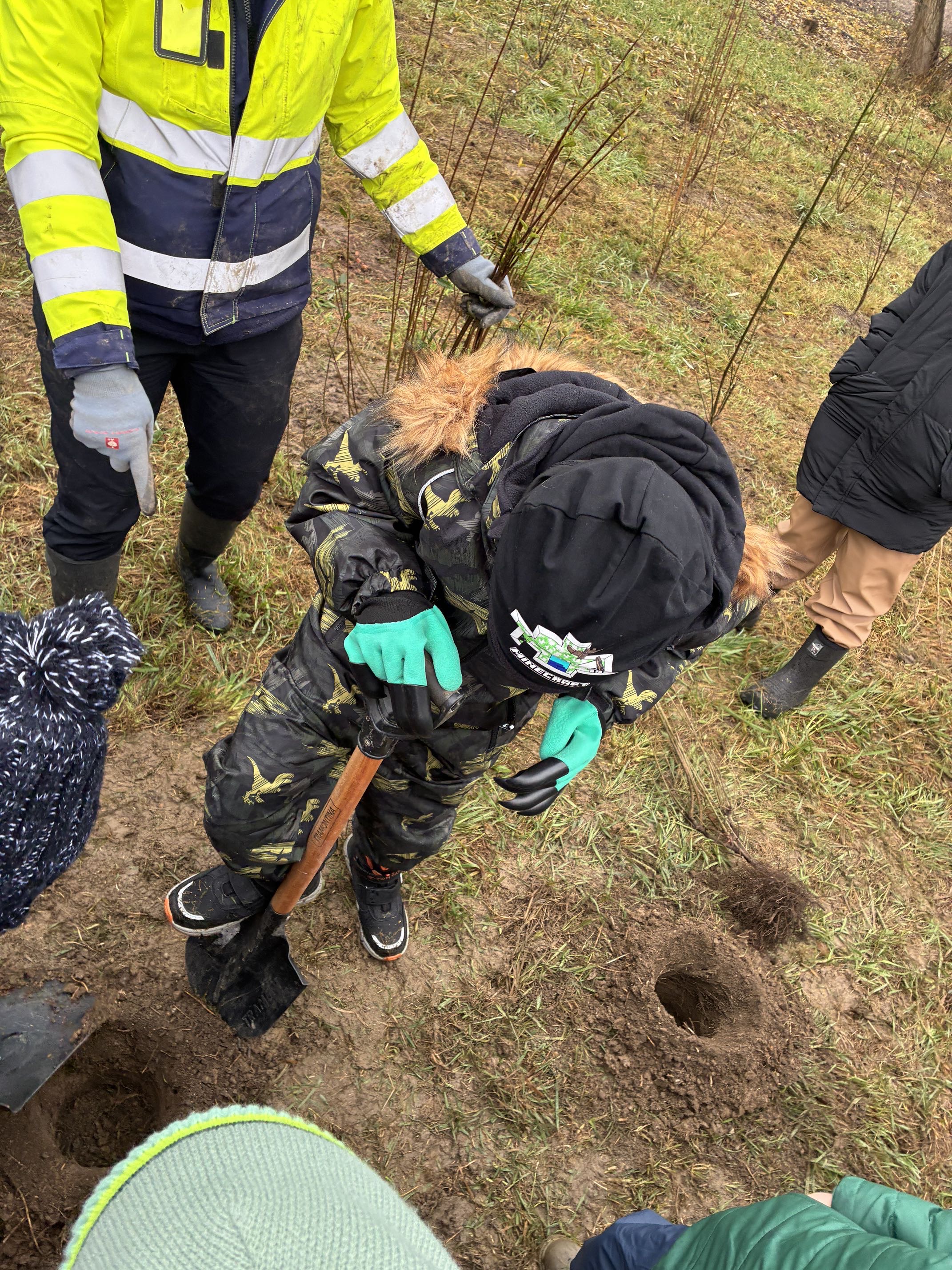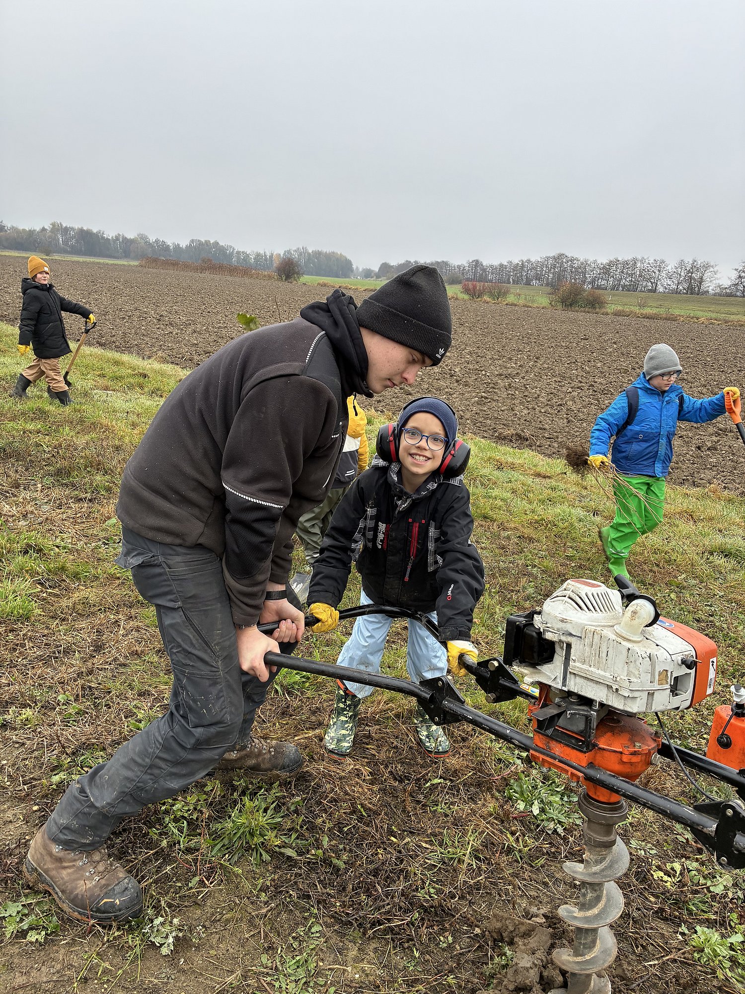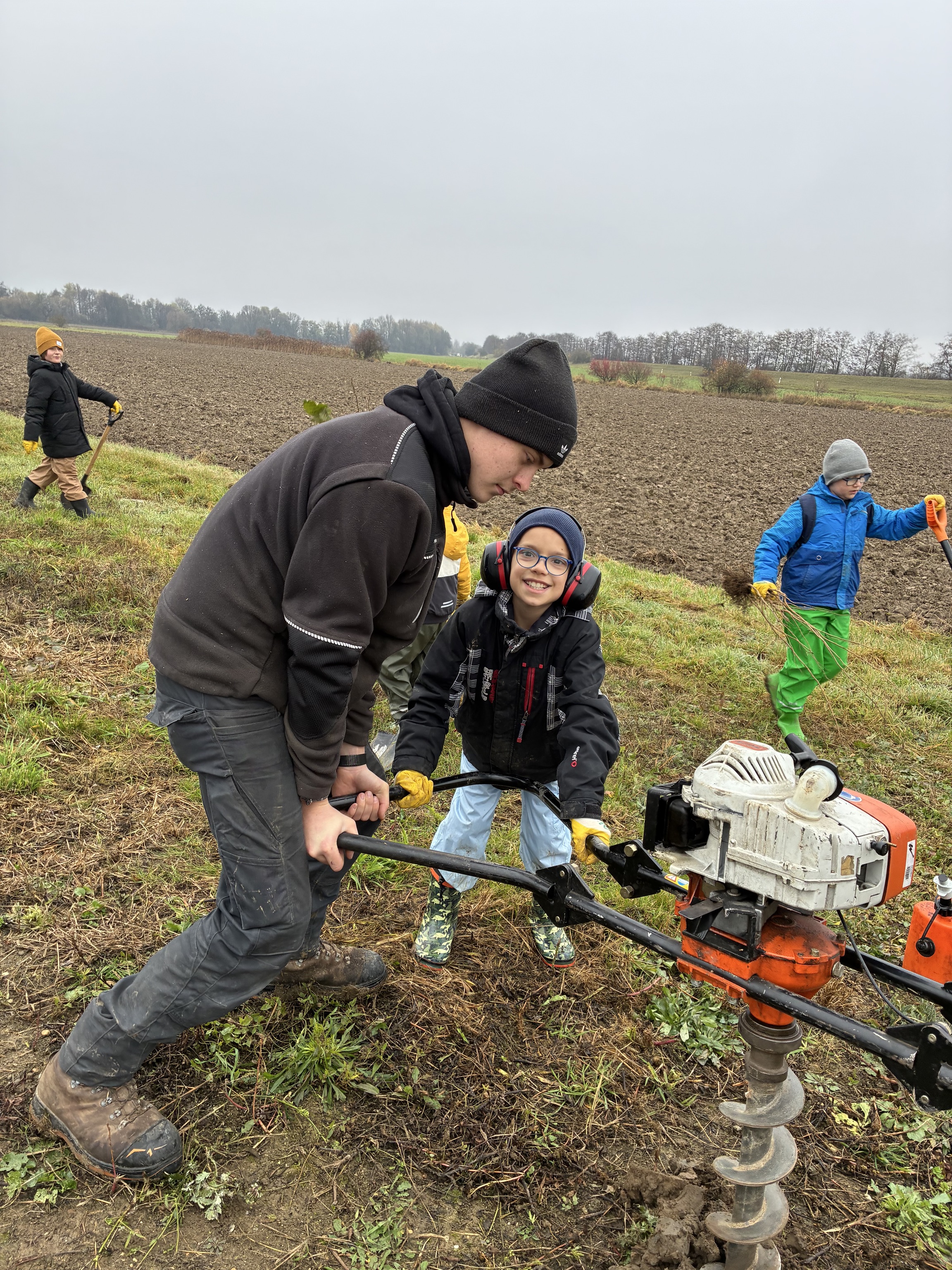 Ausgestattet mit Gummistiefeln, Matschhose, Handschuhen und Spaten durften wir nach einer kurzen Begrüßung und Einweisung sofort loslegen. Loch schaufeln, Staude rein, Erde drauf, gießen, fertig. Zwei Stunden – nur unterbrochen durch eine Brezen-Pause – wurde geschaufelt, gebuddelt, gebohrt und gepflanzt. Zur Erleichterung und weil der Boden ziemlich hart war, war auch schweres Gerät zum Vorbohren der Pflanzlöcher vor Ort.