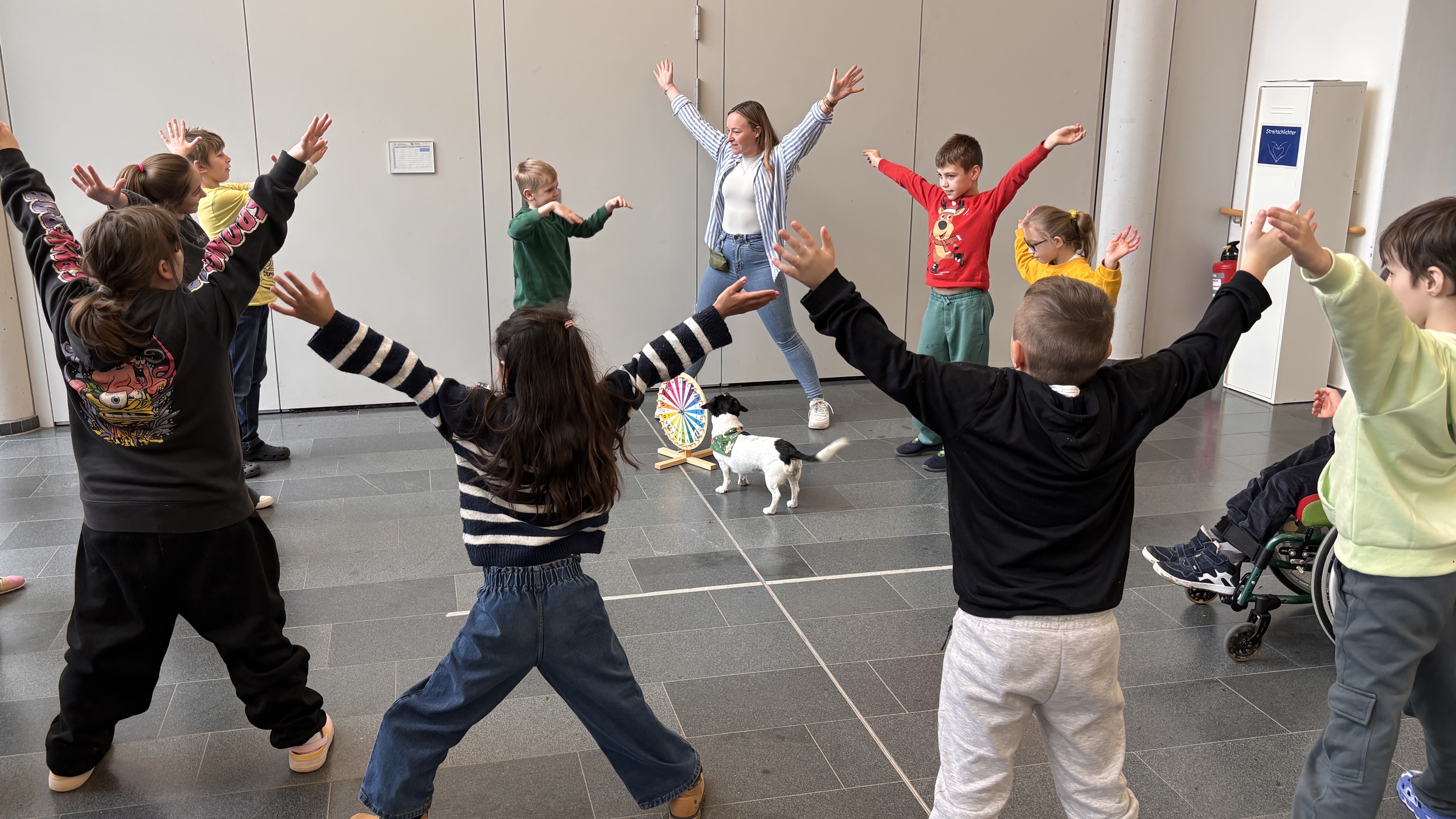 In der Klasse 2/3 durften wir Buchstaben üben und mit Lui machte das gleich doppelt so viel Spaß. Lui drehte an einem Rad mit Buchstaben von A bis Z und wir durften die gezogenen Buchstaben mit unserem eigenen Körper nachmachen.
