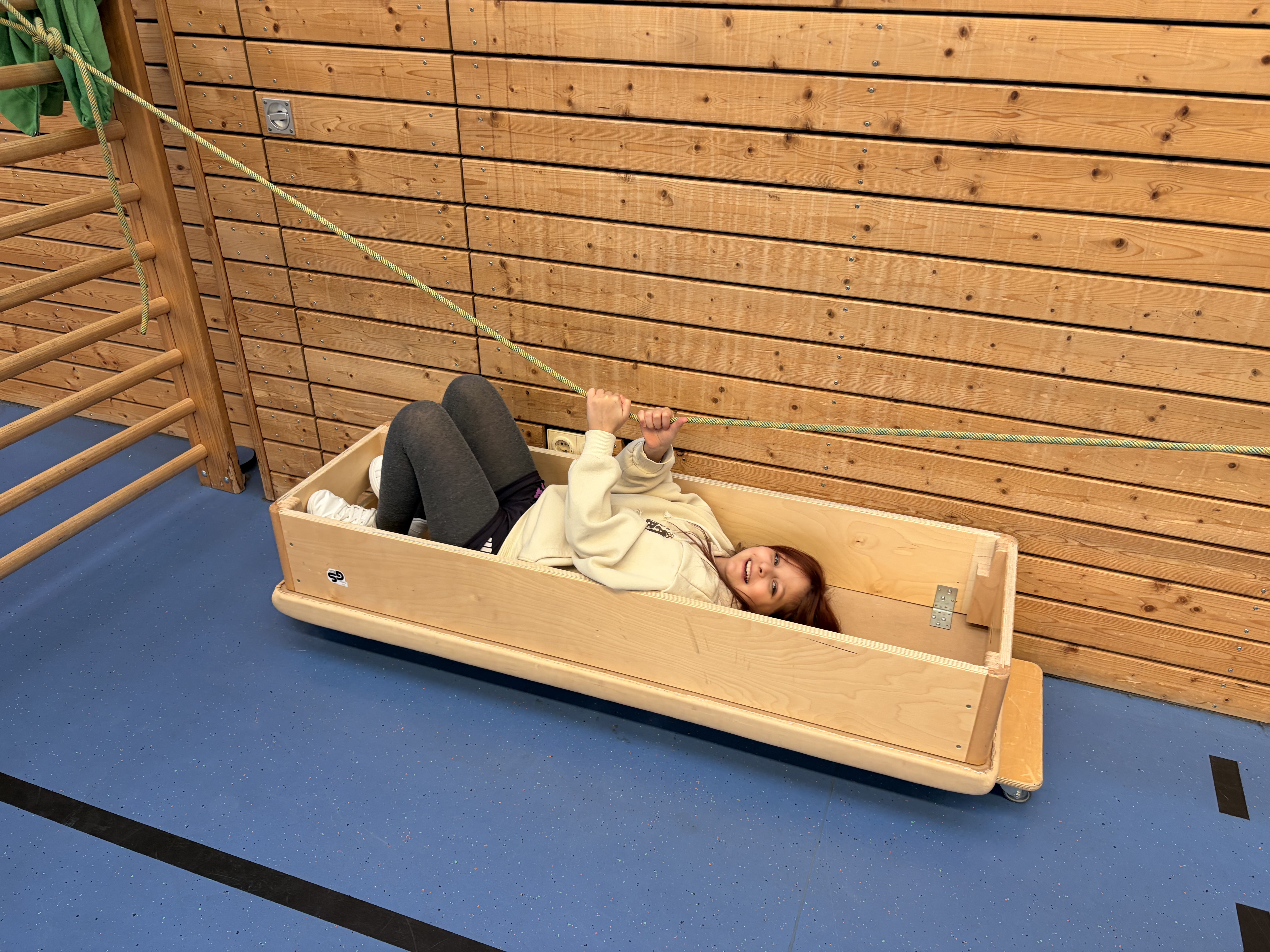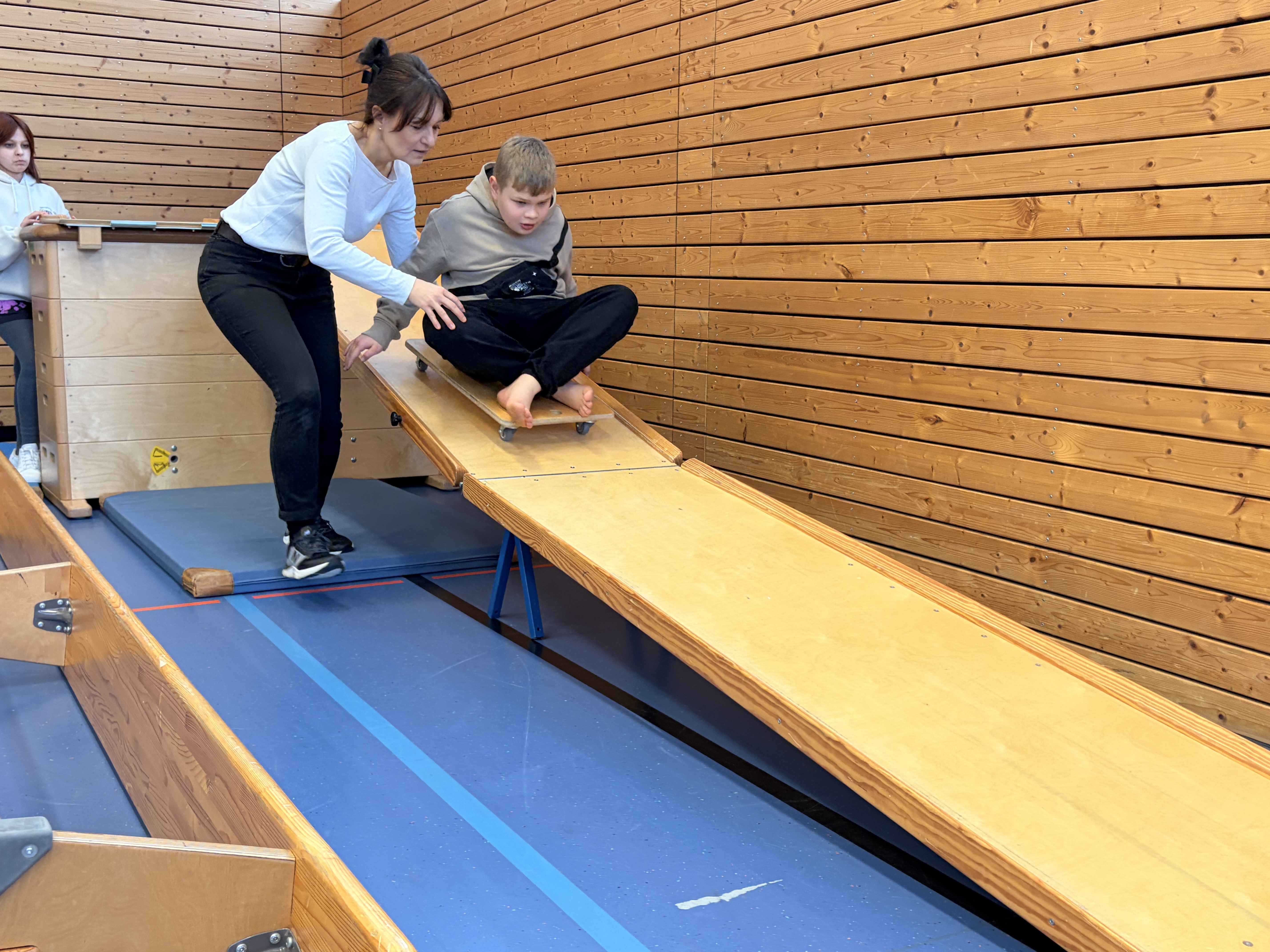 Parallel dazu suchten andere Gruppen die Ruhe und die beeindruckende Perspektive der Natur. Beim Ausflug zum Waldwipfelweg in St. Englmar konnten die Kinder den Wald aus luftiger Höhe erleben. Dieser Spaziergang und der Kletterturm forderte auf spielerische Weise die Motorik und bot gleichzeitig Raum für gemeinsame Entdeckungen und Gespräche fernab des Klassenzimmers. Für die Zeit an der Schule verwandelte das Team der Therapie die schuleigene Turnhalle in eine winterliche Sportarena. Bei Stationen wie Biathlon, Skisprung, Bobfahren und Eishockey konnten die Schülerinnen und Schüler ihre Geschicklichkeit und Koordination unter Beweis stellen und dabei ihr Selbstvertrauen stärken.
