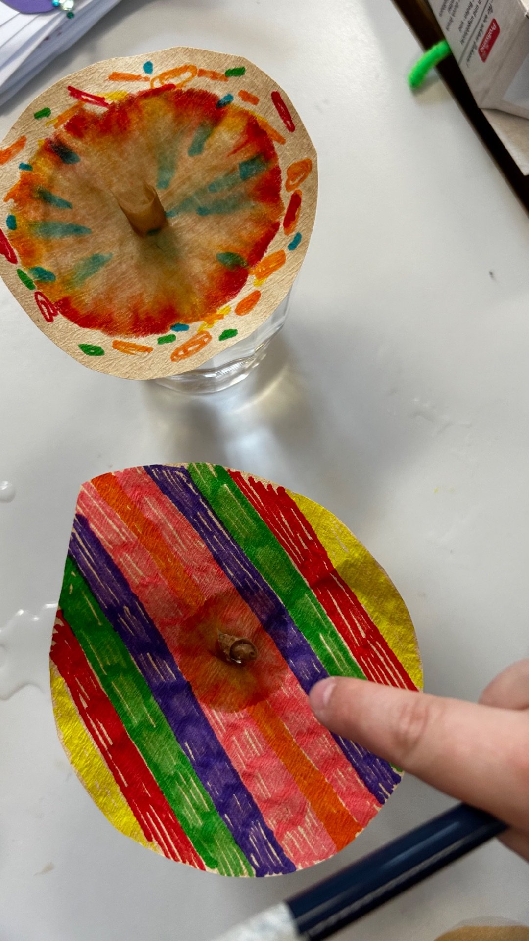 Zuerst wurden die Filter mit Filzstiften ganz bunt bemalt. Anschließend stellten die Kinder die bunten Filter in ein Glas mit Wasser. Besonders spannend war zu beobachten, wie sich das Wasser langsam ausbreitete und die Farben ineinander verliefen. Die Kinder schauten dabei neugierig zu wie nach und nach unterschiedliche Muster entstanden. Nachdem die Kaffeefilter am Heizkörper getrocknet waren, wurden sie mithilfe von Holzklammern und Pfeifenputzern zu bunten Schmetterlingen.