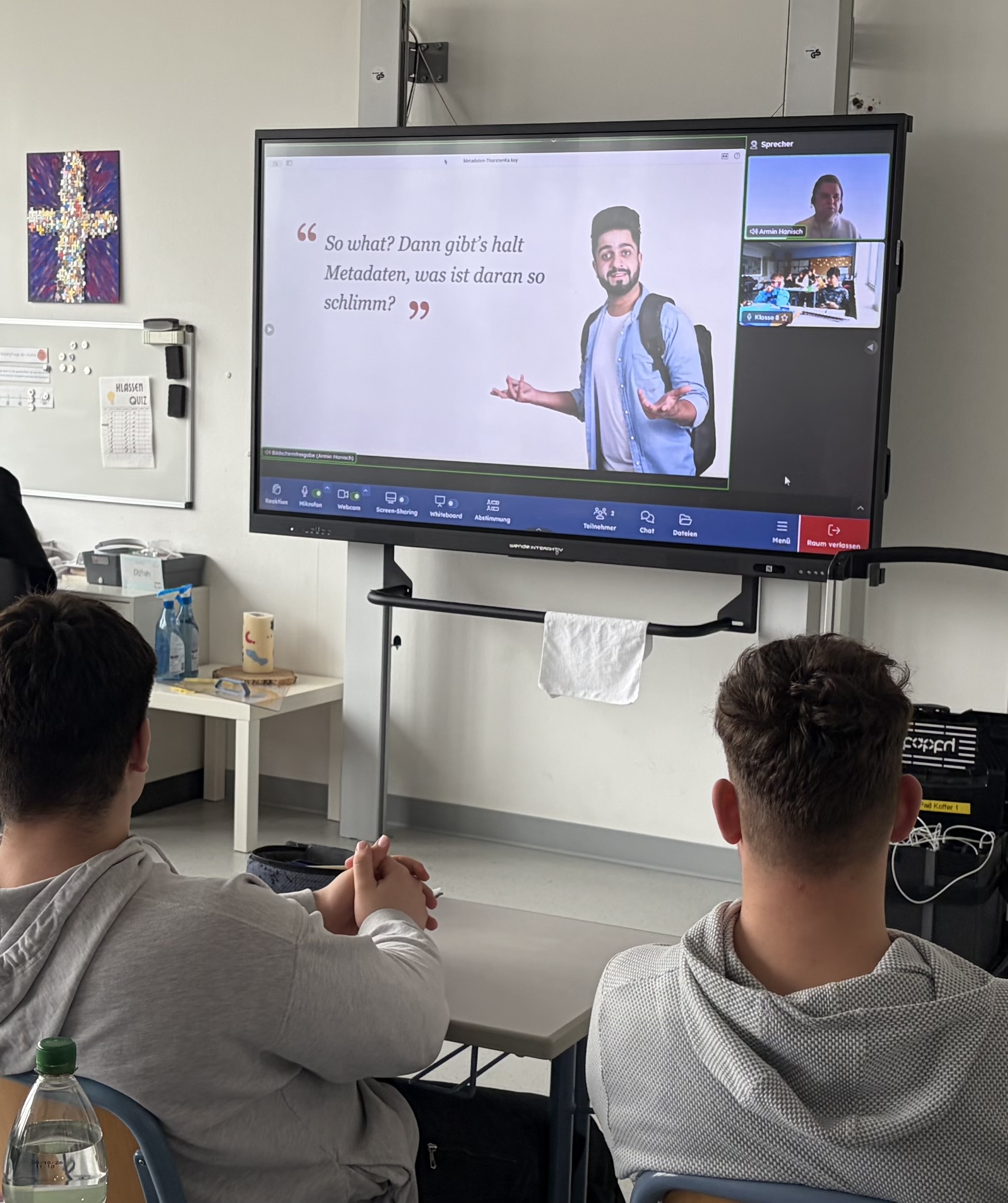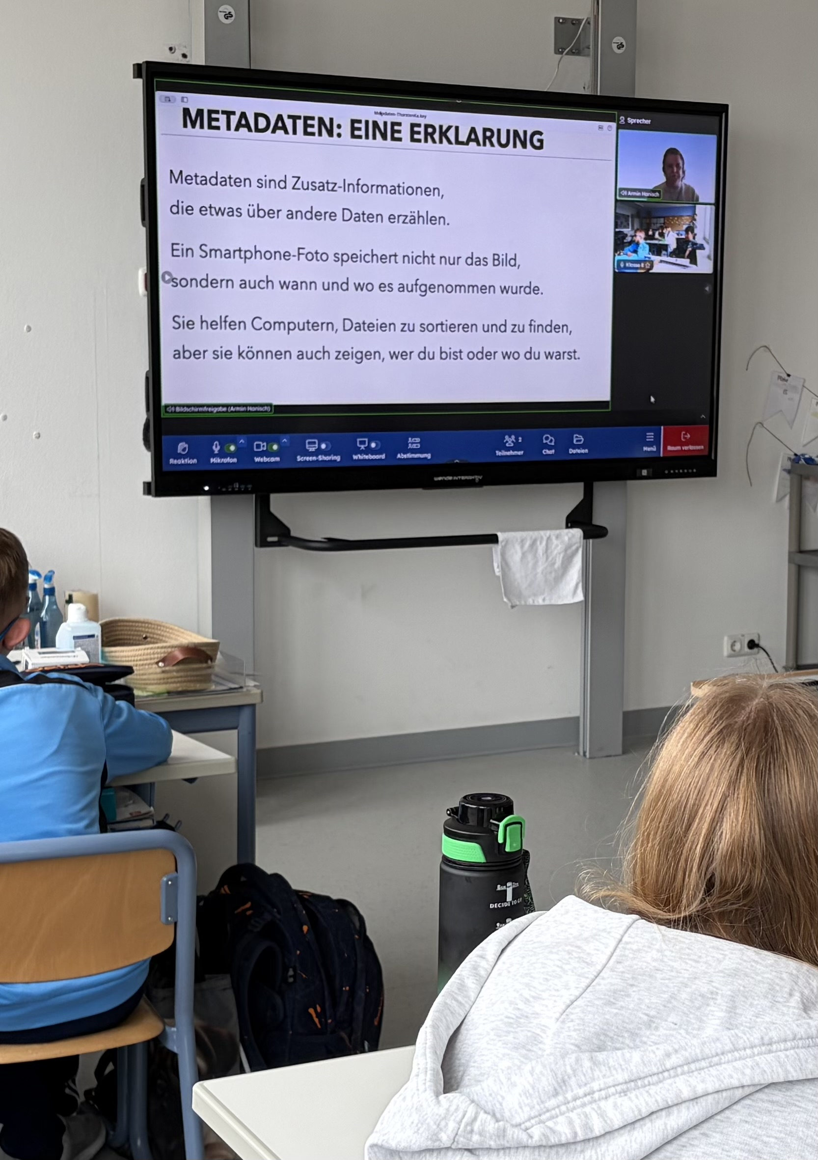 Dabei zeigte Armin Hanisch anhand praktischer Beispiele, wie Metadaten überall um uns herum stecken: im Smartphone, in Apps, in Fotos und sogar in modernen Autos. Die Schüler*innen lernten, dass kleine Informationen wie der Zeitpunkt einer Nachricht oder der Ort eines Fotos ein detailliertes digitales Profil über sie erstellen können – mit Auswirkungen auf Preise, Werbung und sogar Versicherungsbeiträge.