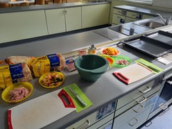 Gemeinsam haben wir unseren Arbeitsplatz vorbereitet und die Zutaten verarbeitet, wie z. B. die Paprika klein geschnitten und den Schinken gewürfelt.