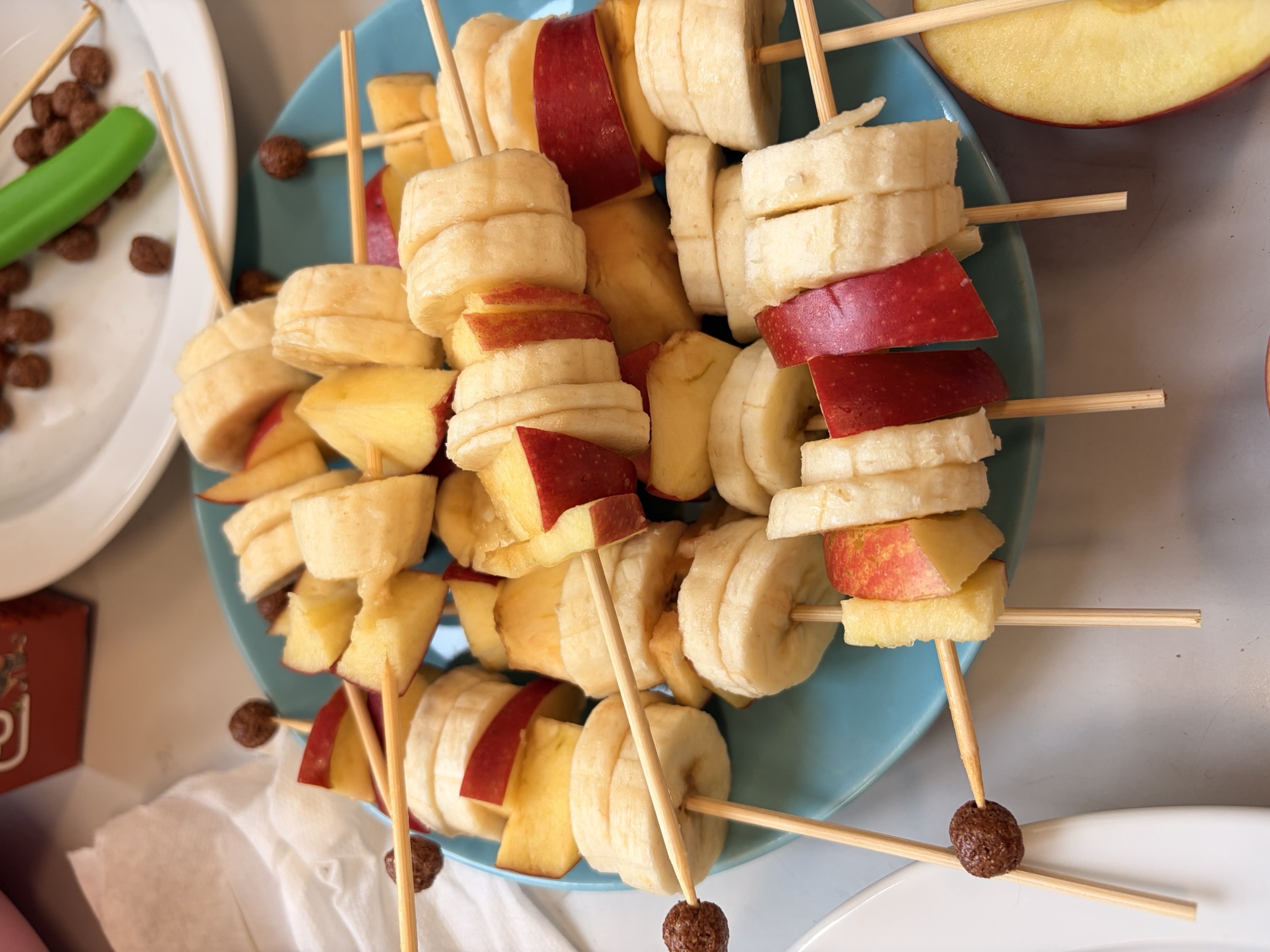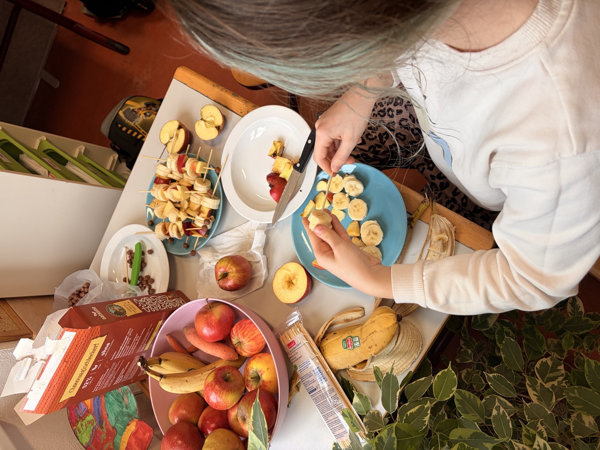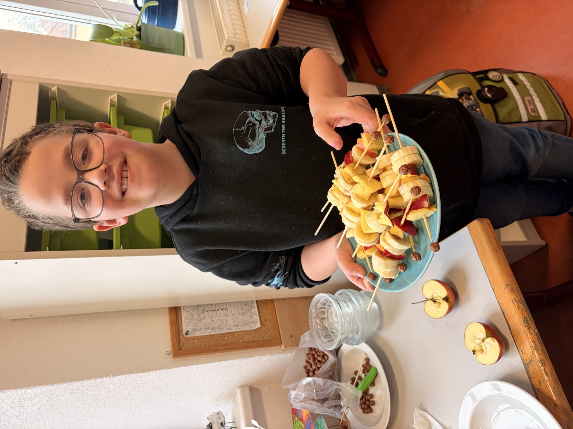 Zuerst wurden in der Stadt die Holzspieße gekauft. Im Anschluss haben die Kinder dann das leckere Schulobst verarbeitet. Sie unterstützten sich gegenseitig und gaben sich gerne hilfreiche Tipps.