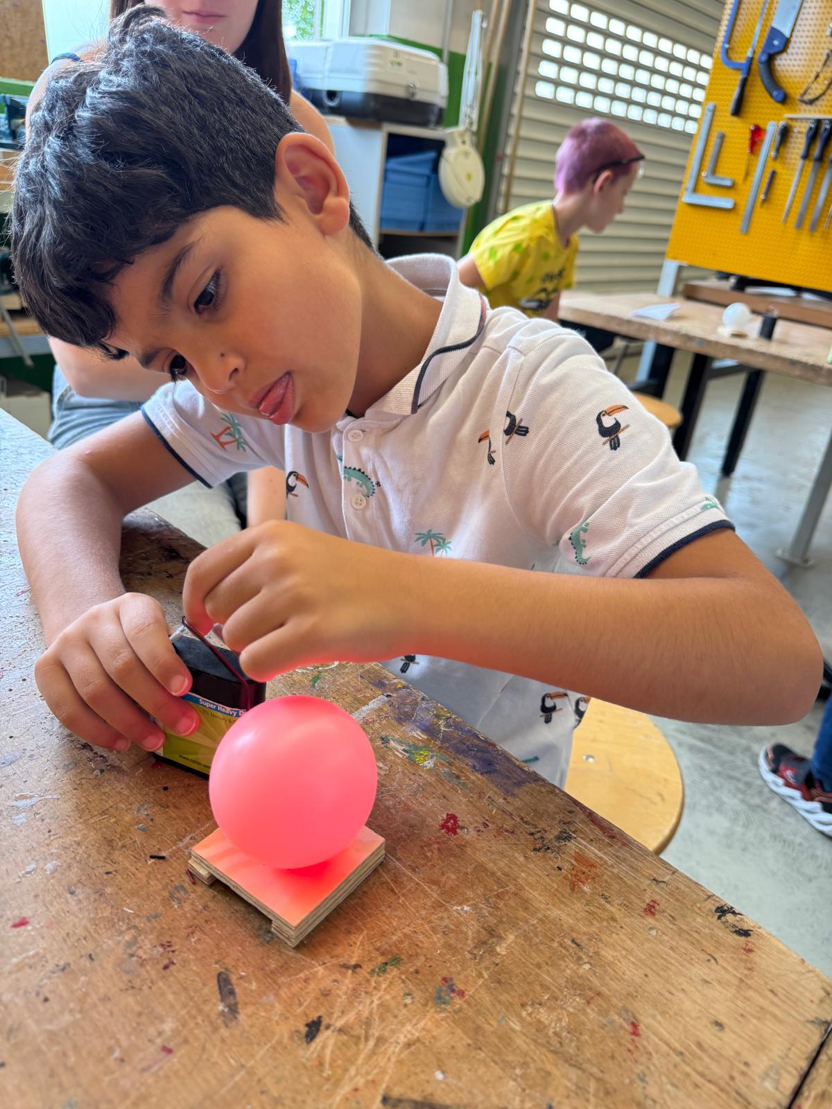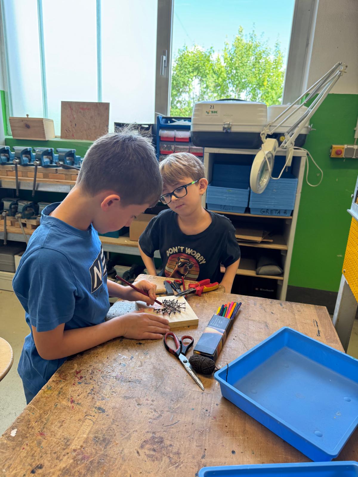 Am zweiten Tag ging es mit viel Energie weiter – im wahrsten Sinne des Wortes: Die Schülerinnen und Schüler bauten einen Solar-Ventilator, der ganz ohne Steckdose funktioniert. Beeindruckend: Die Gruppen waren so motiviert und schnell, dass am Ende noch genug Zeit für ein Zusatzprojekt blieb. Gemeinsam wurde gehämmert und gespannt – beim Nagelbild-Projekt („String Art") konnten die Kinder ihrer Kreativität freien Lauf lassen und ganz individuelle Kunstwerke gestalten.