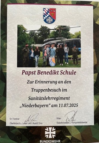 Am Freitag, den 11.07.2025 besuchte die Klasse 9v der Papst Benedikt Schule das Sanitätslehrregiment Niederbayern in der Bundeswehrkaserne Feldkirchen. Der Ausflug bot den Schülerinnen und Schülern spannende Einblicke in den Alltag und die Aufgaben der Bundeswehr-Sanitäter.